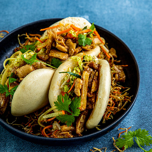 - 7. Täytä sämpylät: Kasaa sämpylöiden väliin vegaanisia paloja ja marinoituja kasvissuikaleita. Ripottele pinnalle tuoretta korianteria.