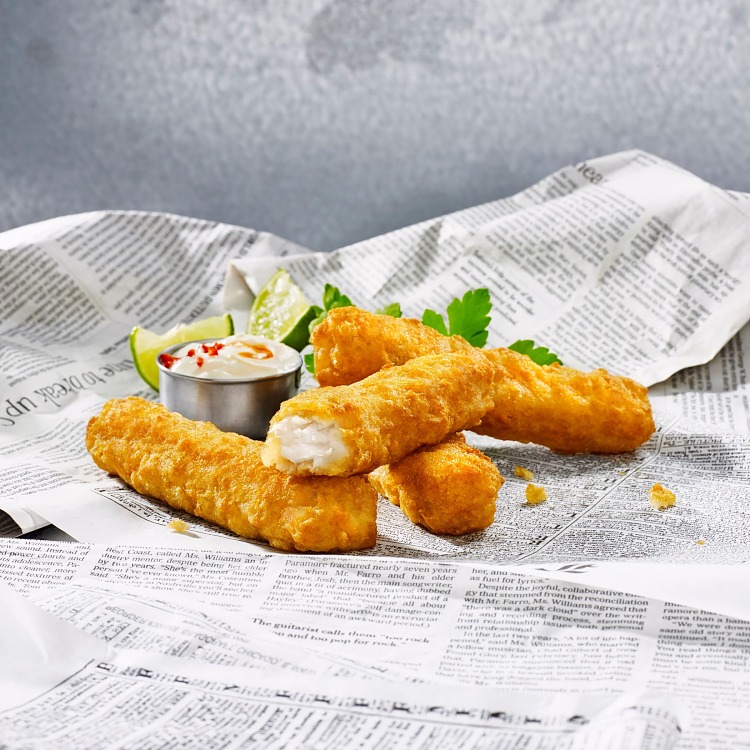Alaskanseitifilee* (KALA) 56 % (Theragra chalcogramma), jauho (VEHNÄ, riisi, maissi), kasviöljy (rapsi, auringonkukka), vesi,VEHNÄTÄRKKELYS, suola, nostatusaine (E450, E500), rypälesokeri, SINAPPIJAUHE, VEHNÄGLUTEENI, rasvaton MAITOJAUHE,valkosipulijauhe, luontainen aromi (mm. SINAPPI), karamellisoitu sokeri, mustapippuriuute. *Pyydetty koilliselta tai luoteiselta Tyyneltämereltä.