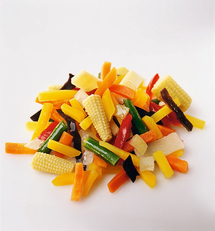 Porkkana (keltainen, oranssi), sipuli, punainen paprika, vihreä papu, bambunverso, minimaissi ja kiinalainen viljelty sieni (Black fungus). Sipulia lukuunottamatta kaikki vihannekset ovat esikeitettyjä.