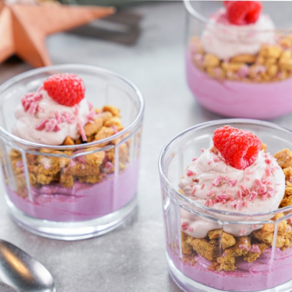 5. Murskaa Digestivekeksit ja lisää ne mustaherukkaseoksen päälle. Annostele keksimurujen päälle vadelmapyree kermaseos.