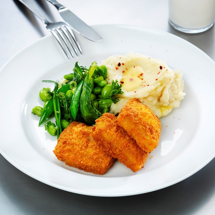 Turska* (KALA) 56 % (*Gadus morhua*), gluteeniton korppujauho (riisijauho, kikhernejauho, maissitärkkelys, suola, rypälesokeri), rapsiöljy, maissitärkkelys, riisijauho, maissijauho, perunatärkkelys, suola, mausteet (paprika, pippuri ), sipulijauhe ja mausteuute (mustapippuri). *Pyydetty Koillis-Atlantilta