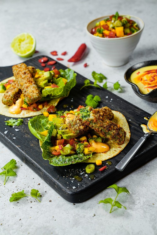 Rapea pinaattipuikko kermaisella pinaattitäytteellä. Leivitetty pretzelmurusilla.