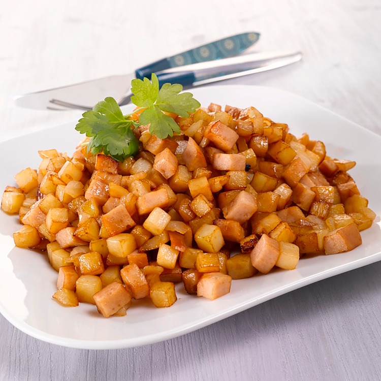 Paistettu peruna (peruna, rapsiöljy, rypälesokeri, suola), makkara 18 % (sianliha 10 %, vesi, ihra, kamara, tärkkelys, suola, mausteuute (mustapippuri, paprika, valkosipulijauhe), sianlihaproteiini, perunakuitu, rypälesokeri, mausteuute (rosmariini, mustapippuri, valkosipuli, inkivääri), sipulijauhe, liha-aromi, säilöntäaine (natriumnitriitti)), sipuli, sokeri, kasvisjauhe (suola, perunatärkkelys, sipuli, palsternakka, porkkana, rapsiöljy, mausteuute (lipstikka, purjo), lipstikka, kurkuma), suola, karamellisoitu sokeri, mustapippuri, korianteri, timjami.